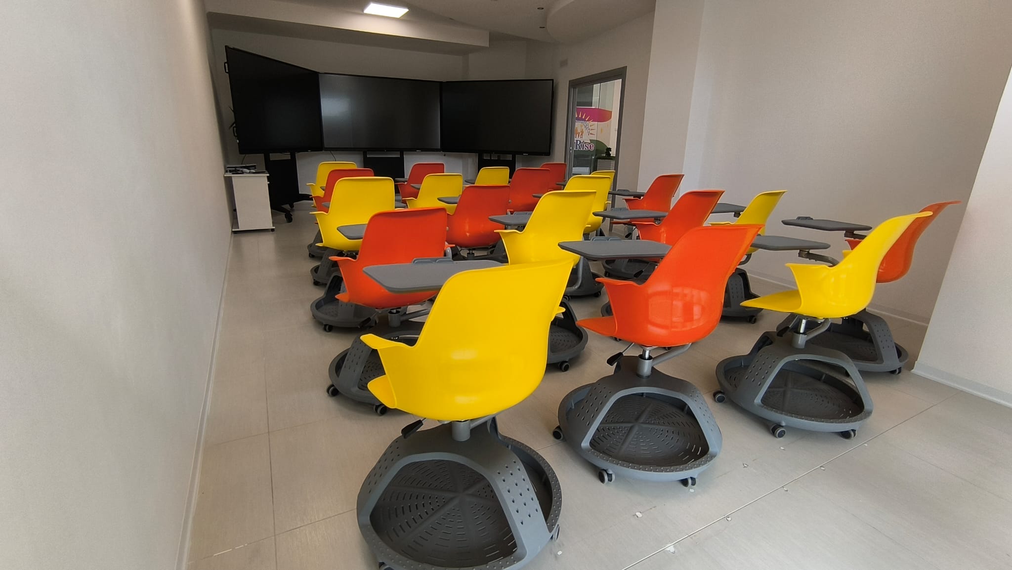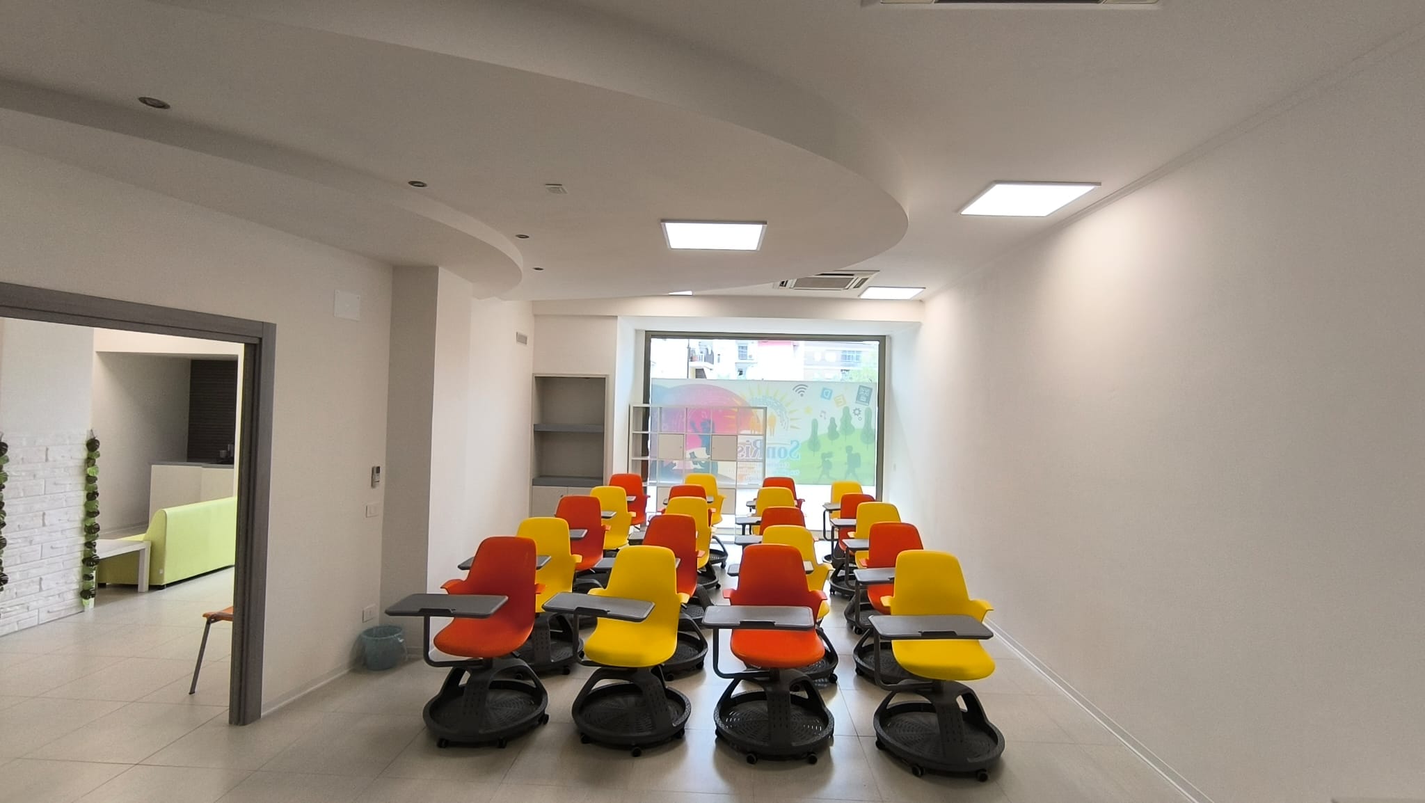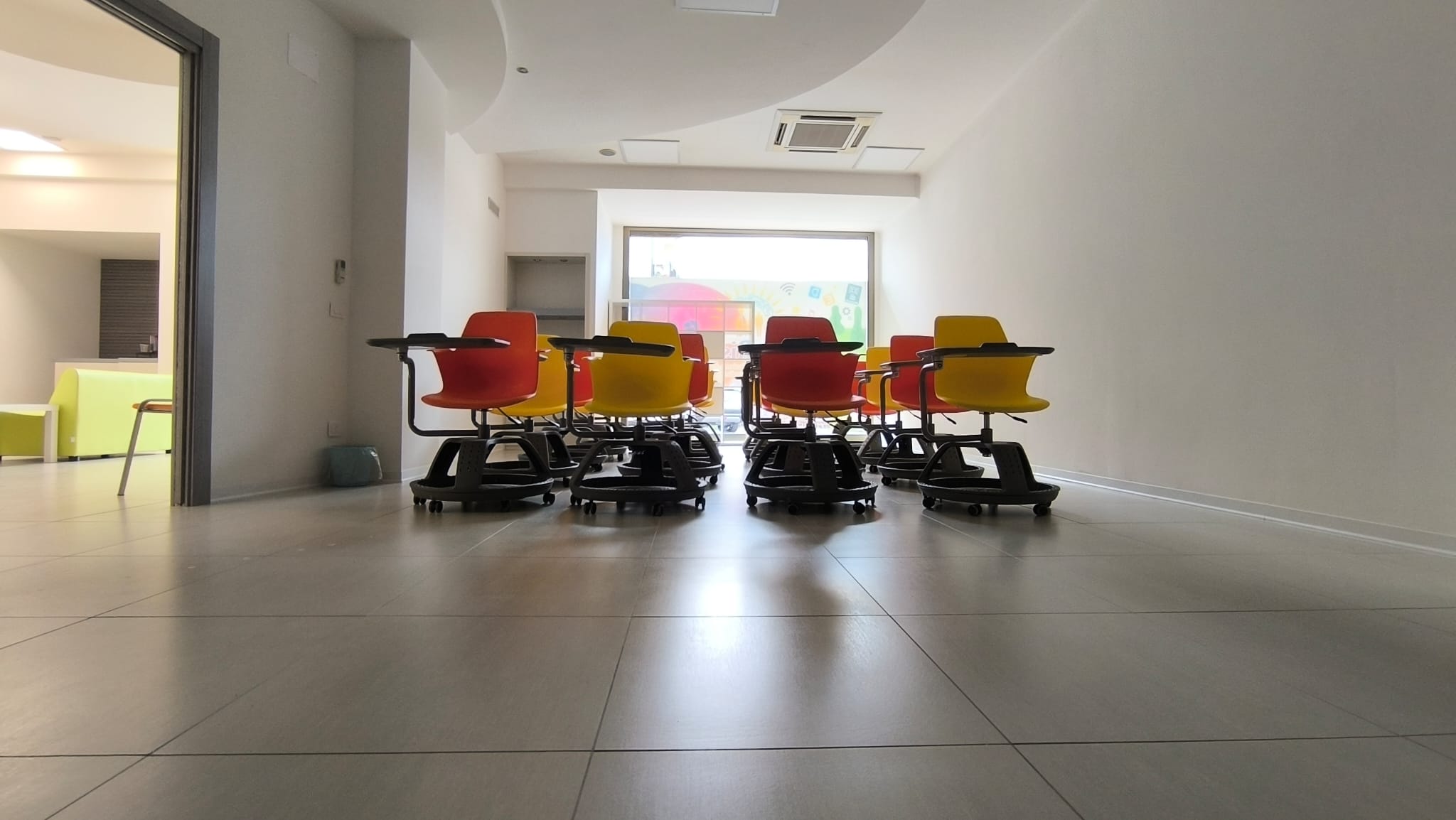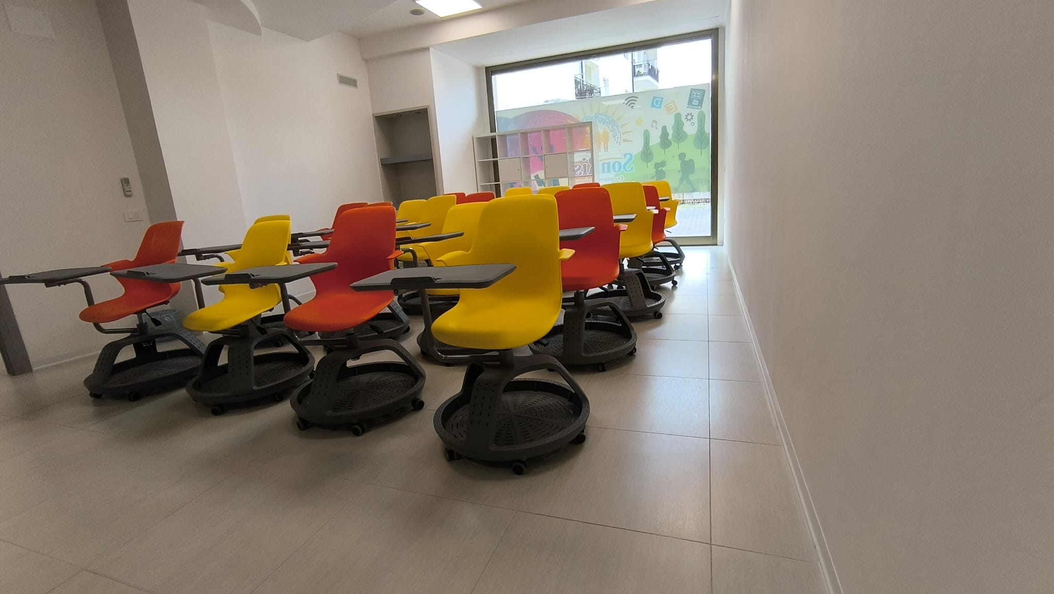 Banchi Dinamici e Multifunzione: La nostra aula per le lezioni frontali è progettata per il movimento. Banchi a rotelle con scrittoio integrato permettono di passare istantaneamente dalla lezione individuale ai gruppi di studio, rompendo la rigidità della scuola tradizionale.