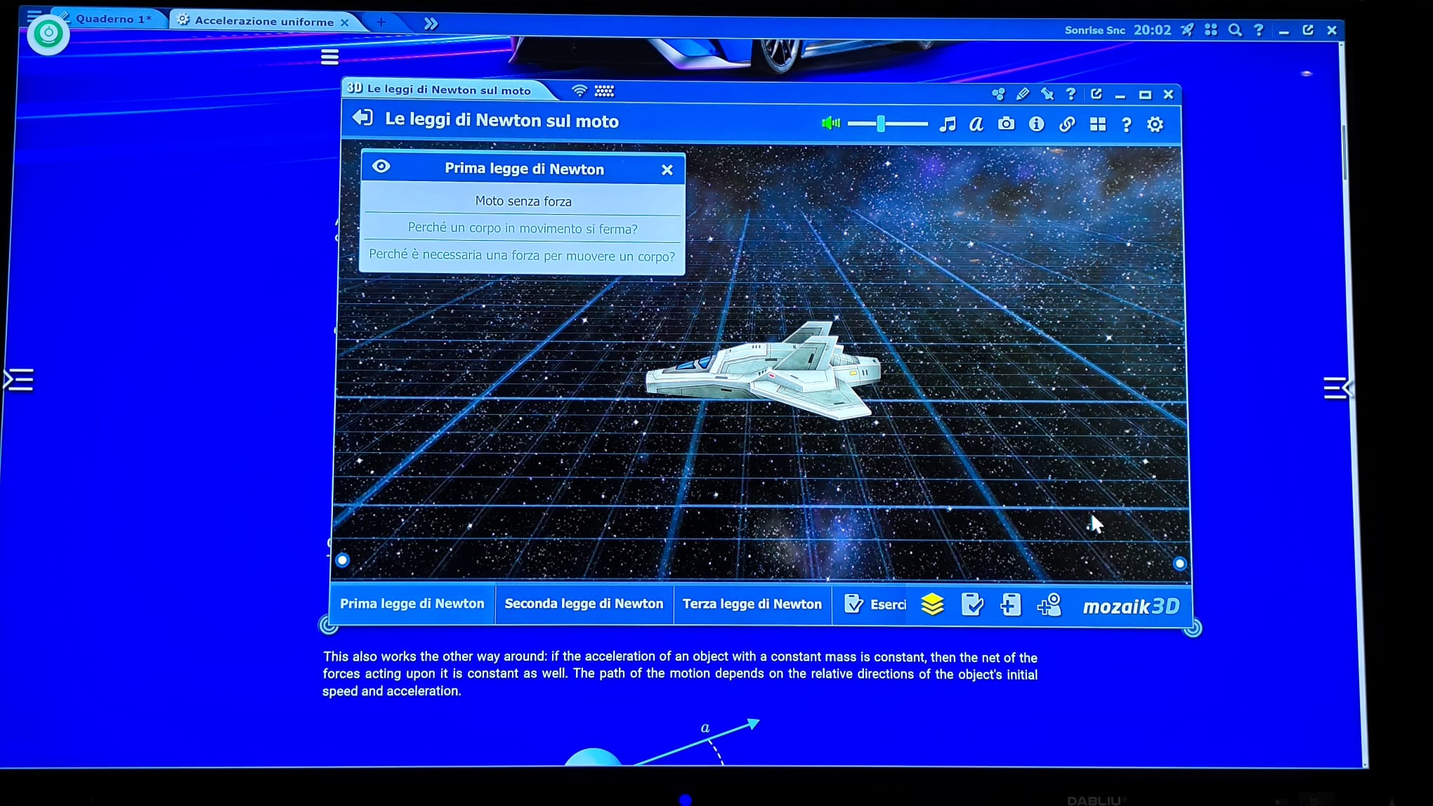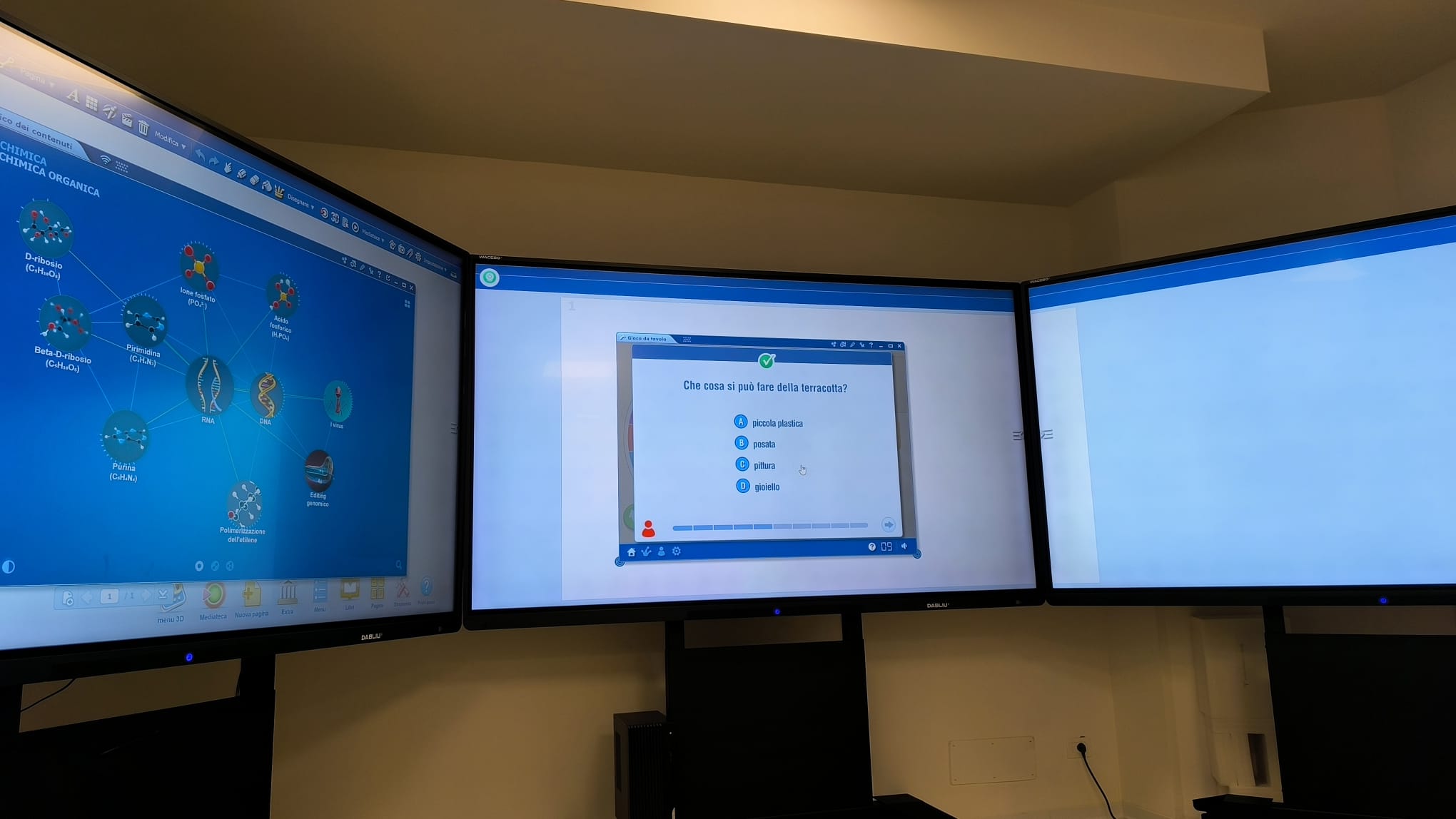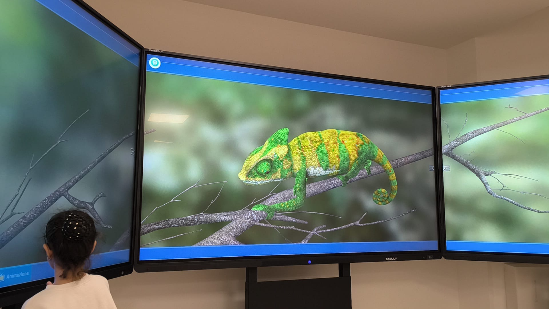 La nostra sede non è una semplice aula, ma un portale verso infiniti mondi. Il fulcro di questa esperienza è la combinazione tra la nostra Aula Immersiva da composta da 3 schermi da 100 pollici ciascuno e la piattaforma Mozaik Education, leader mondiale nella visualizzazione didattica 3D.